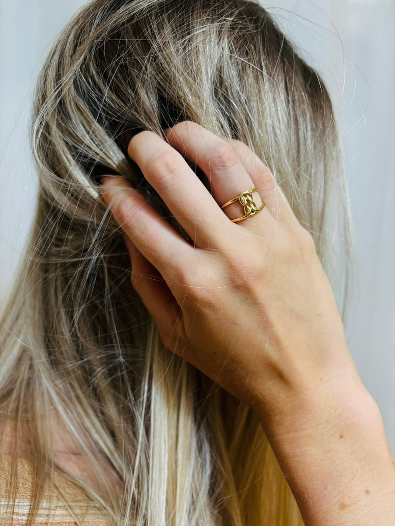 Anel delicado e estiloso com design de nó duplo, representando união e elegância. Perfeito para compor combinações sofisticadas no dia a dia.