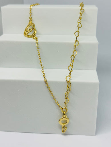 Descubra a beleza deste colar com um pingente que entrelaça um coração e uma chave brilhante. Este acessório elegante carrega um significado profundo de afeto e oportunidade, ideal para uso diário ou como um presente significativo para alguém especial.