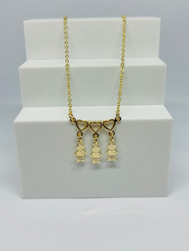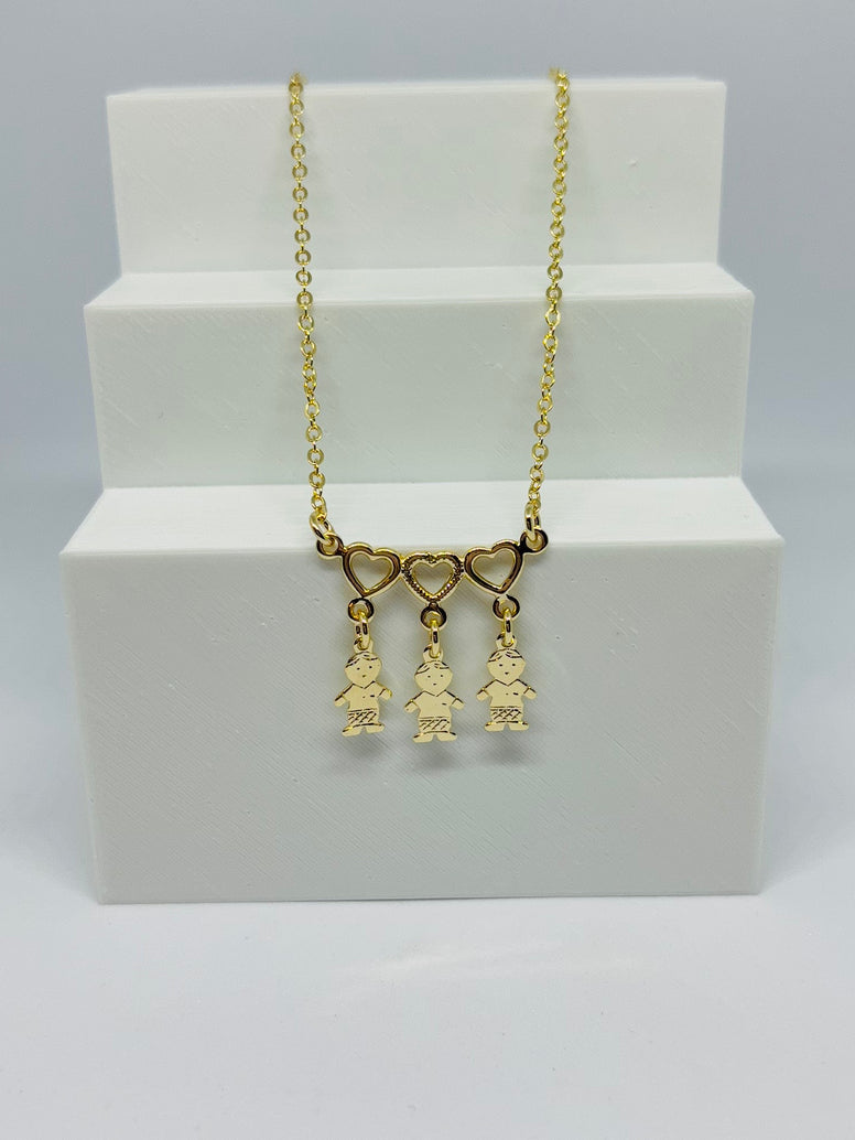 Apresentamos um colar encantador com uma delicada corrente dourada e pingentes tres meninos, unidos por pequenos corações. Este colar simboliza o amor familiar e a alegria da infância, perfeito para mães, avós ou para celebrar laços especiais.
