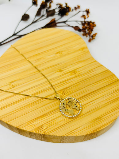 Um colar incrível para quem ama viajar e sonhar alto! Medalhão vazado com o mapa-múndi em destaque, contornado por zircônias brilhantes. Um acessório elegante e cheio de significado.