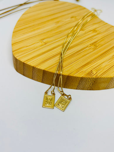 Um clássico da joalheria, o escapulário traz proteção e fé em um design sofisticado. Com duas medalhas religiosas detalhadas, é perfeito para quem busca um acessório elegante e significativo.